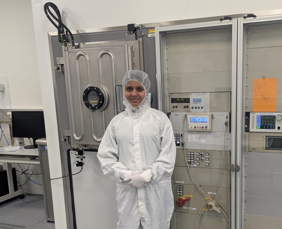 Sheena Shaji processing the GaAs quantum dot chips in the cleanroom. She is in front of the physical vapor deposition chamber where electrical contacts are deposited on the chip.Sheena Shaji, a Post-Doctoral Research Associate at Heriot-Watt University was awarded an M4QN international exchange award to visit Prof. Armando Rastelli’s group at Johannes Kepler University. The visit took place from 8-14 March 2026.